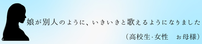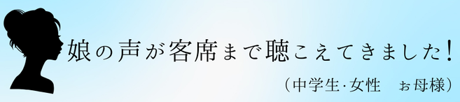 今日、いくつかの学校が集まって歌う会があったのですが、娘の声が客席まで聴こえてきました!昨年より歌い方の姿勢も綺麗で、先生のご指導の成果を感じました!いつもご指導ありがとうございます。今後ともよろしくお願いいたします。